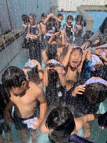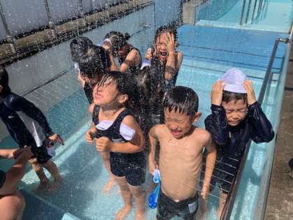 夏真っ盛りのような、プール日和です。子どもたちは、プールに入れるので大喜び。
