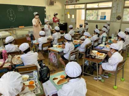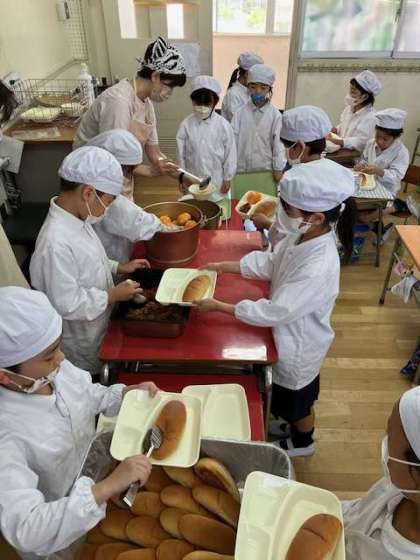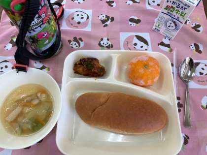 今日の給食献立は、黒糖パン・かぼちゃのミートグラタン・鶏肉と野菜のスープ・冷凍みかん・牛乳です。