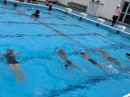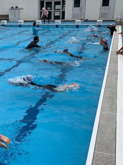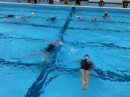 クロールや平泳ぎなどの泳法は、まだしません。壁を蹴ってそのまま進む「蹴伸び」は上手にできていますね!
