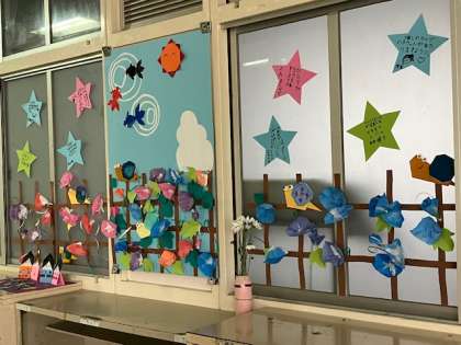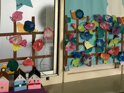 いきいき教室の窓の掲示物が変わりました。梅雨のアサガオ特集です。