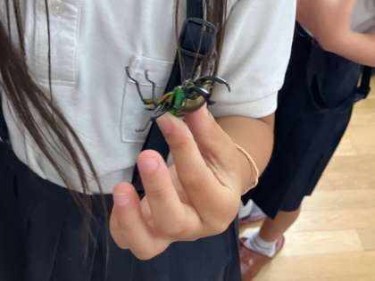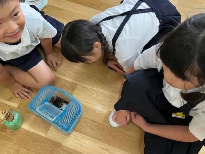 3年生の教室で飼育しているカブトムシ、クワガタムシ。