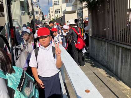 児童代表のあいさつで、見送りの保護者や教職員に、元気よく「行ってきま〜す!」でバスに乗り込みました。