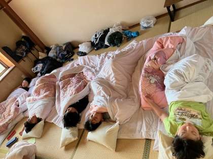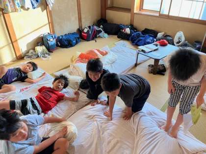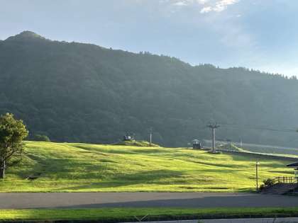 清々しいとってもいい天気です。ロッジ前のゲレンデの草原が輝いてます。