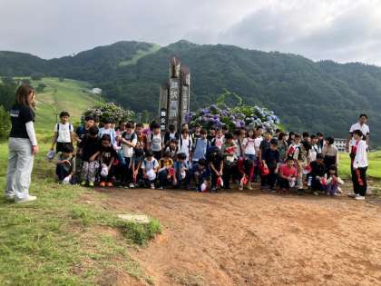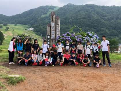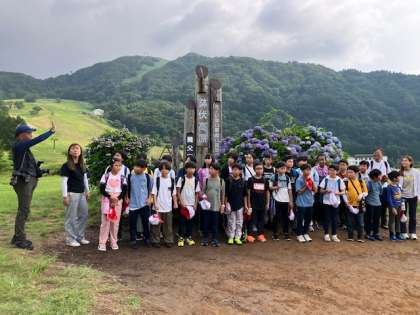 今から山登りです。その前に、クラス、学年の記念写真を撮影しました。