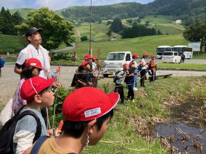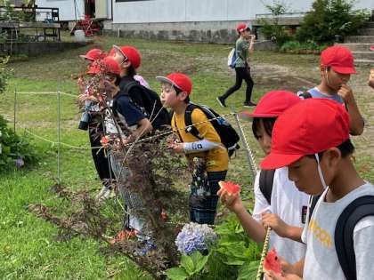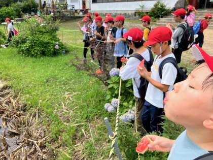 スイカのタネは、池に飛ばします!男子も女子も飛ばします!どんどん飛ばしました!