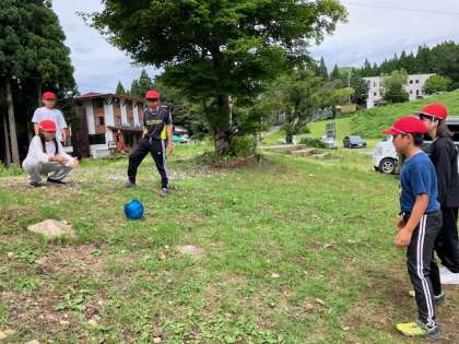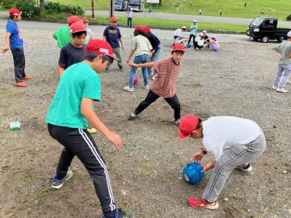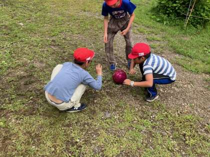 坂を使ったり、交代で休憩したり、色々工夫しながら、ボールを転がし続けます。