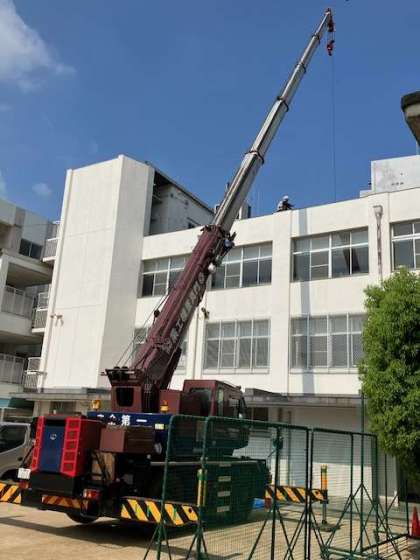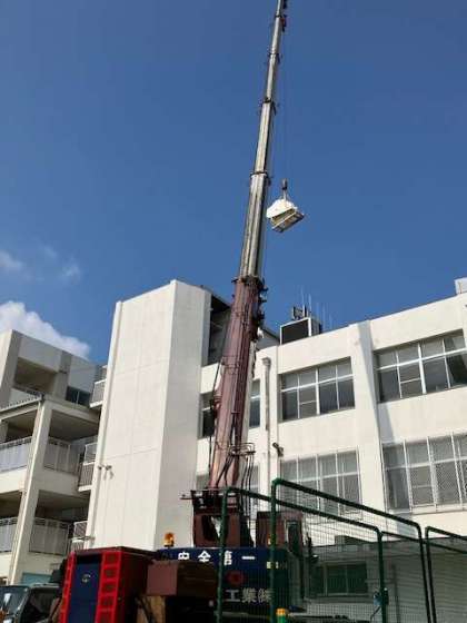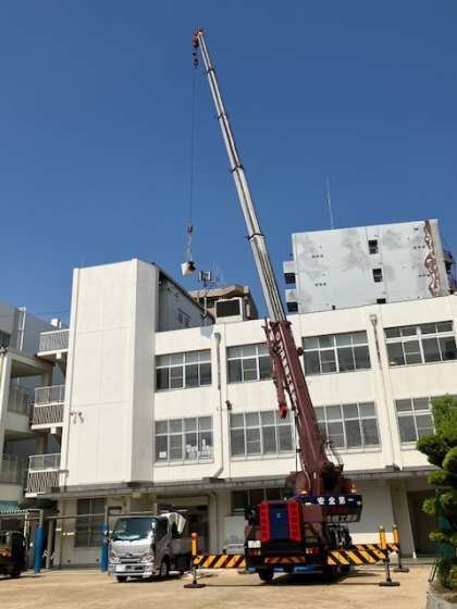 給食調理室の器材の交換ですが、大きな器材もクレーン車で持ち上げればイチコロでした。