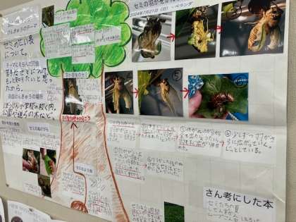 3年生の教室。「セミの成長」を詳しく調べた研究がありました。羽化するところから写真も撮って、立派な研究です!すばらしい!