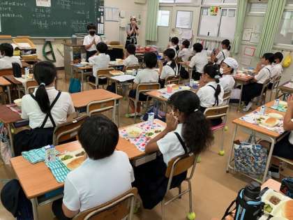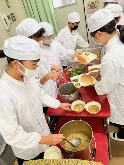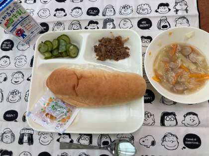 今日の給食献立は、コッペパン・牛肉のソース煮・スープ・きゅうりのピクルス・アプリコットジャム・牛乳です。