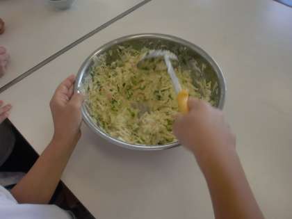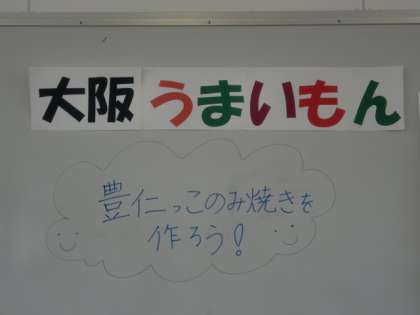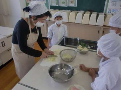 4年生が地域の「お好み焼き名人」からお好み焼きの作り方を学びました。包丁で切る作業は名人がしてくださいました。