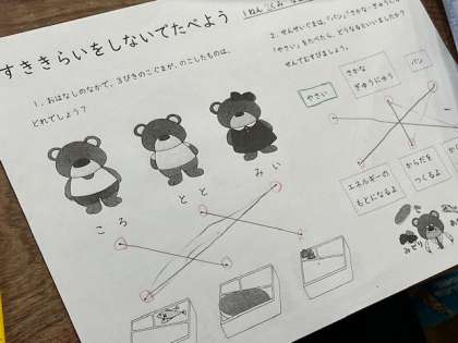 お話を聞いて、色塗りをしたりしながら楽しく栄養について学習しました。