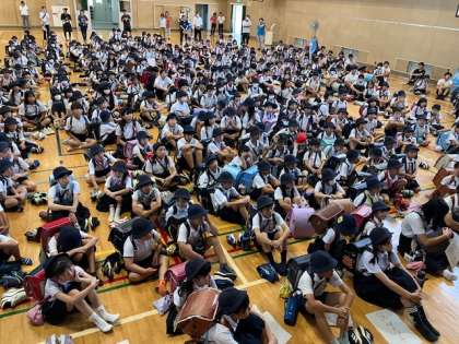 全員が講堂に集まって、集団登校班ごとに並びました。