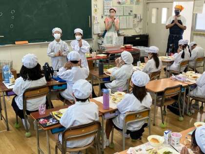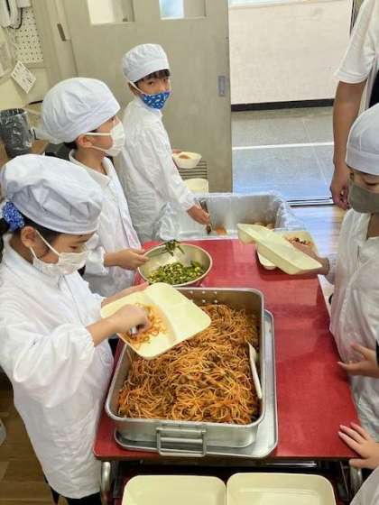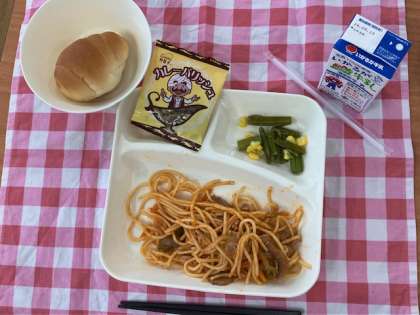今日の給食献立は、ミニコッペパン・イタリアンスパゲッティ・グリーンアスパラガスとコーンのサラダ・カレーフィッシュ・牛乳です。