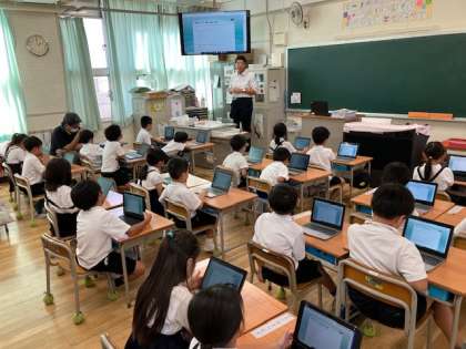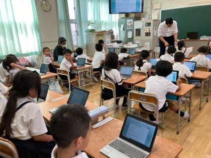1年生の教室で。今年度の「学校アンケート」をパソコンでしています。学校生活についてどう感じているか、いろんな質問で把握します。