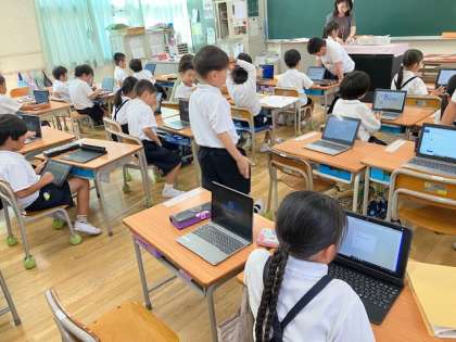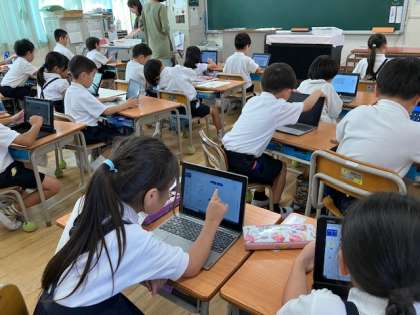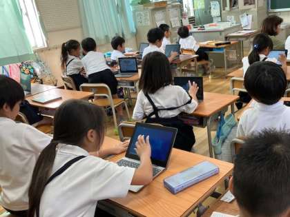 1年生、パソコンでの授業です。今、どんな気持ちかを答える「心の天気」をしてから、デジタルドリルをしました。