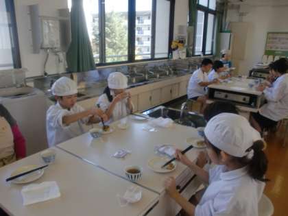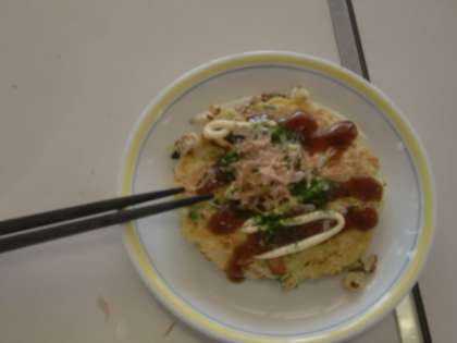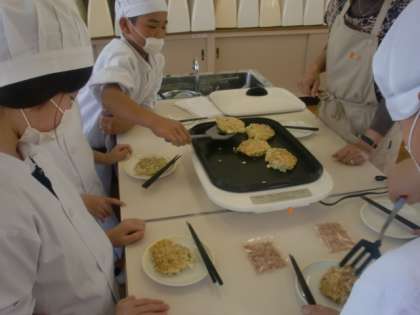 ホットプレートでおいしいお好み焼きができていくと、いい香りが教室中に広がりました。
