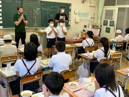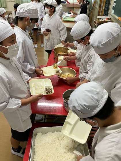 今日の給食献立は「月見の行事献立」です。ごはん・一口がんもと里芋の味噌煮・牛肉と野菜の炒め物・みたらし団子・牛乳です。