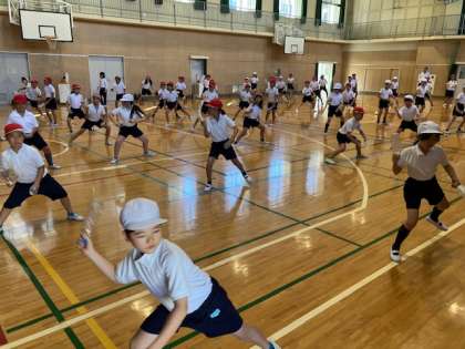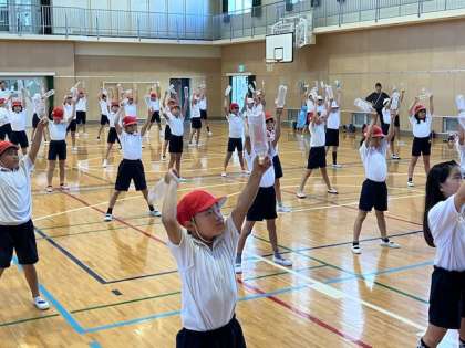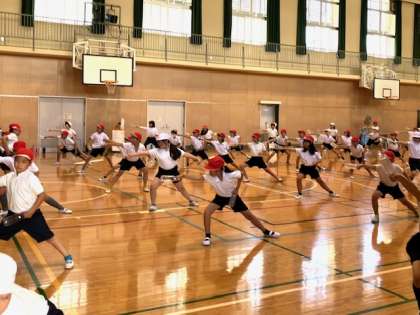 4年生の練習。エイサーのキレのある演舞に迫力が出てきました。全員での「イーヤーサーサー!」の声に感動です。