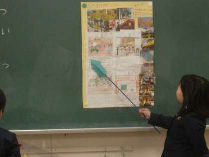町探検で調べたことがらを、班ごとに「町のおすすめしょうかい」としてまとめたものを発表し合いました。