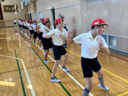 今日は、体型とその動きの練習です。どの学年もそうですが、運動場の暑さ指数が「危険」領域なので、体育館で練習します。もう少し、暑さがマシになれば運動場での練習に入ります。