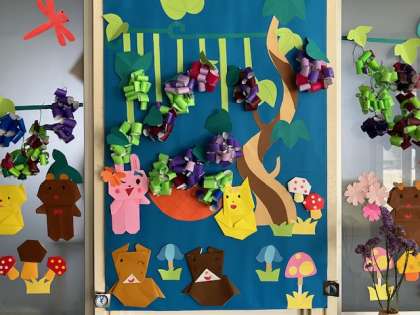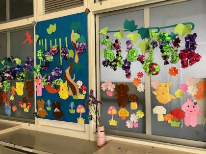 いきいき教室の窓の飾りが、秋のブドウとかわいい動物たちになっています。