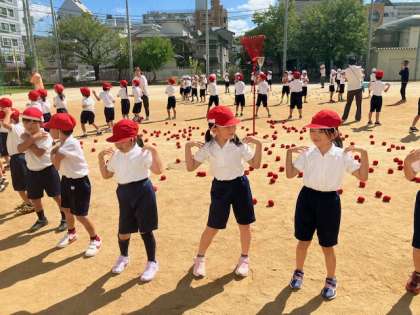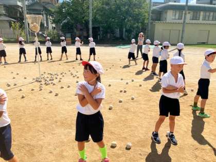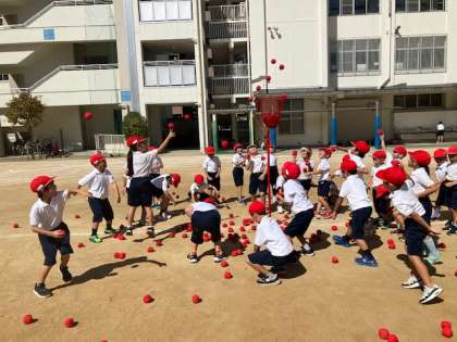 1年生は、アドの唱でのゾンビダンスと、「チェッチェッコリ」の歌に合わせたダンスと組み合わせた玉入れをします。今日は、運動場で初めて玉入れの練習をしました。