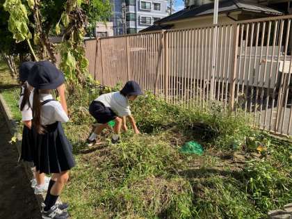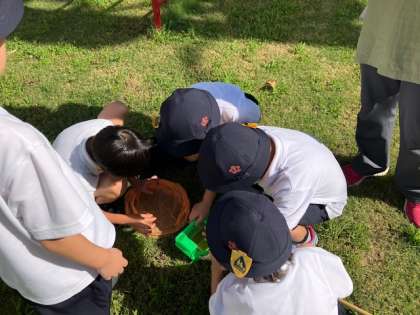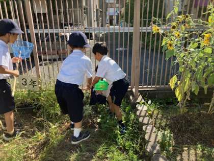 1年生の生活の時間。運動場の隅の花壇や芝生で秋の虫を探しました。