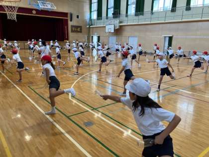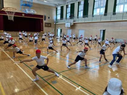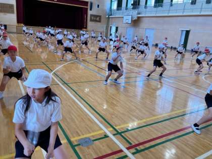 4時間め、運動場ではソーランの練習をしているので、エイサーの練習は体育館で行います。