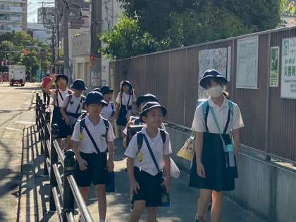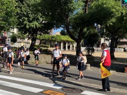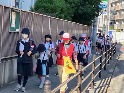 集団登校で、ちゃんと列に並んで歩いています。どの班も上級生が低学年の子どもたちを守ってきてくれる様子があります。すばらしい〜!