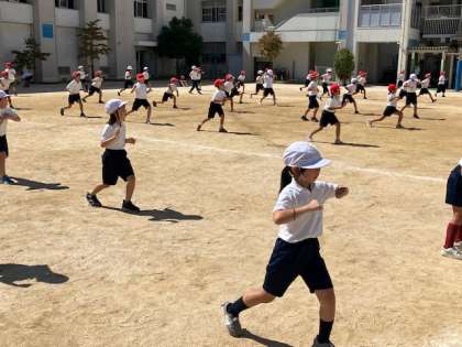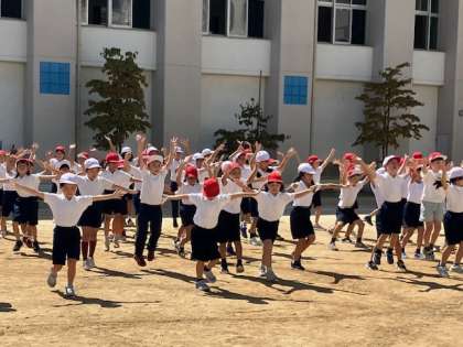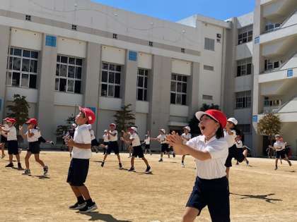 「やってみよう」「できっこないをやらなくちゃ」の曲に乗せて、運動場いっぱいに広がってダンスします。