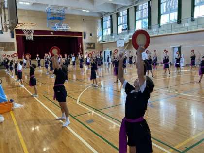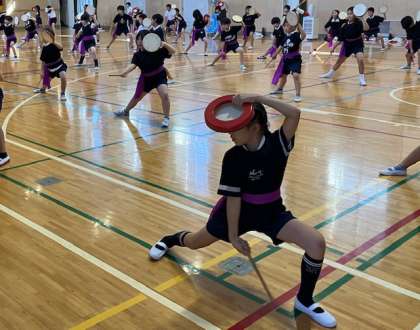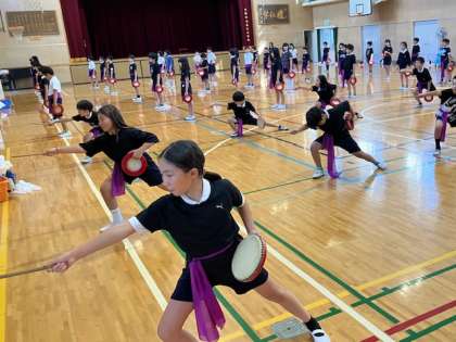 4年生のエイサー。初めて運動会当日の衣装で練習しました。