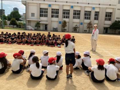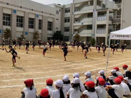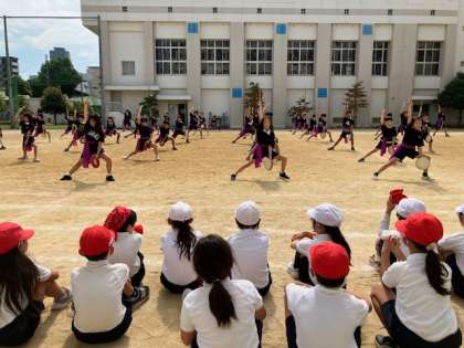 次は4年生が3年生に披露します。法被を身につけた4年生、見るからに凛々しい集団が見事なエイサーを見せてくれました。