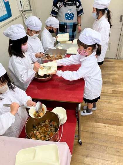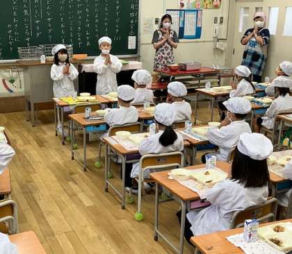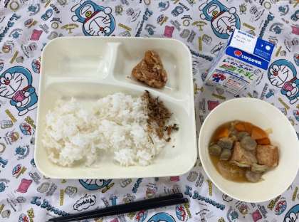 今日の給食献立は、ごはん・鶏肉の竜田揚げ・厚揚げと野菜の煮物・おかか菜っ葉・牛乳です。