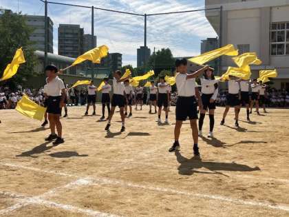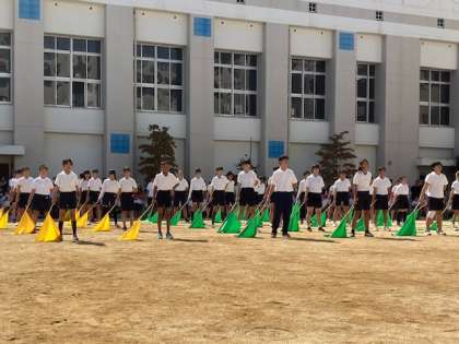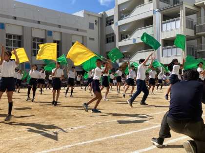 緑と黄が運動場いっぱいに旗めきました。風を切る音がカッコいい!