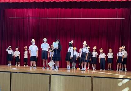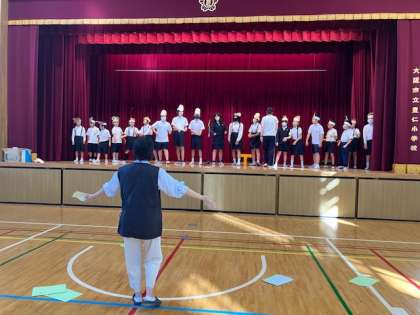 10日後に迫った中国語弁論大会の練習です。「おおきなかぶ」の音楽劇を中国語バージョンでします。19名が自分の役の手作りお面をつけて、動きながら歌をみんなで歌います。