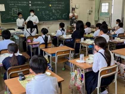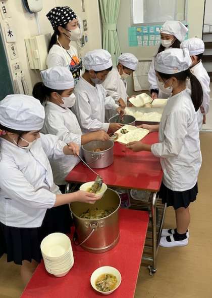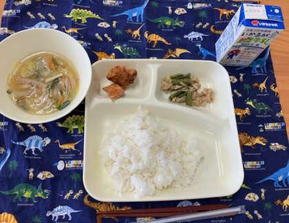 今日の給食献立は、ごはん・鶏肉のチリソース焼き・ツナと三度豆のオイスターソース炒め・焼き豚のスープ・牛乳です。