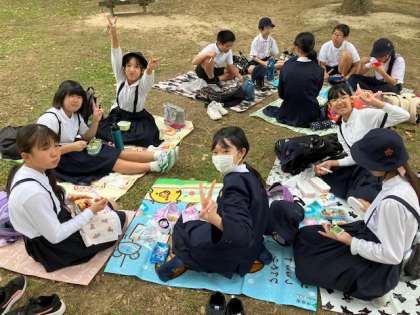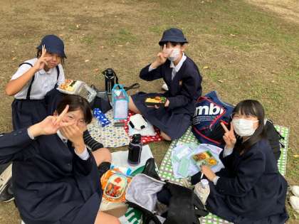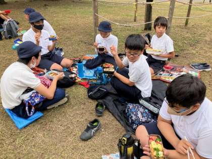 お弁当タイムです。暑くもなく寒くもない、いい行楽日和の広い公園で、楽しくお弁当!