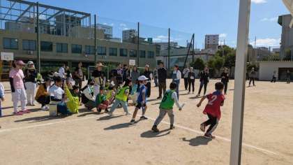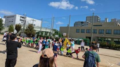 学校や学年も関係なく、混合のチームでの運動会です。