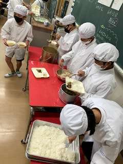 今日の給食献立は、もずくと豚挽肉のジューシー・焼きれんこん・さつま芋の味噌汁・牛乳です。ジューシーは、沖縄料理のまぜご飯です。