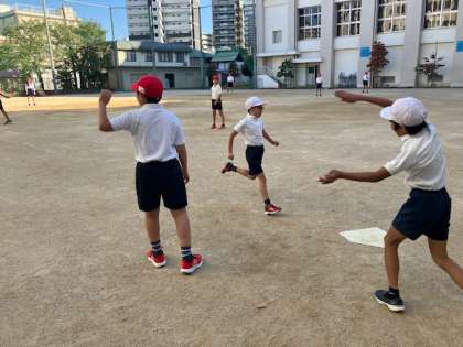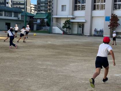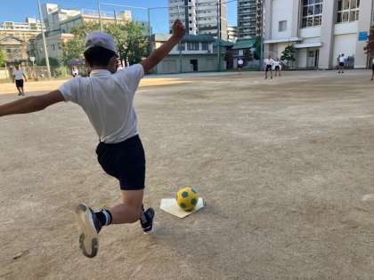 運動クラブ。今日は、キックベースボールです。ホームランを蹴れそうで、なかなかそうはなりません。そこが面白いスポーツですね!