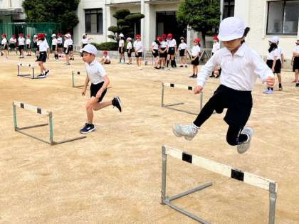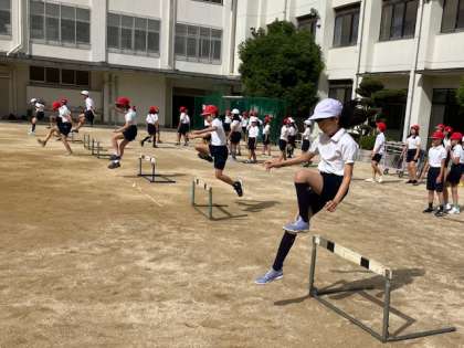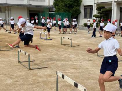 4年生7の体育の時間。ハードルに取り組んでいます。初めは高さも低く、台数も少ないです。慣れてくれば、徐々に高さを上げたり、台数を増やしていきます。