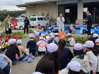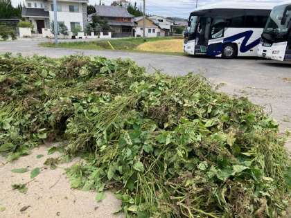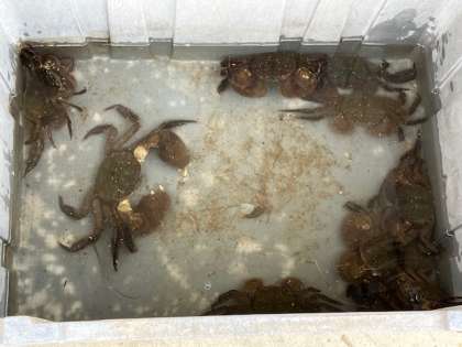 先に収穫された黒豆の山ともずくガニが出迎えてくれました!カニは近くの川で獲れたようです。
