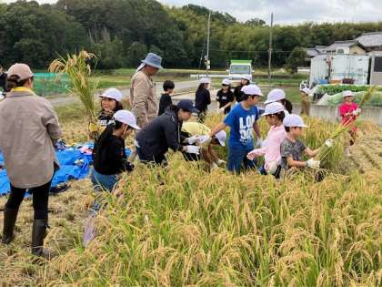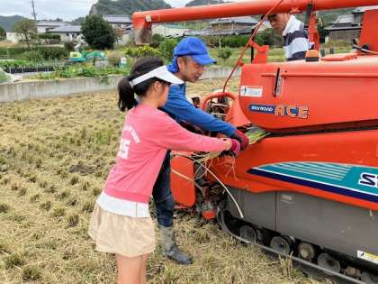 刈り取った稲はコンバインで脱穀します。