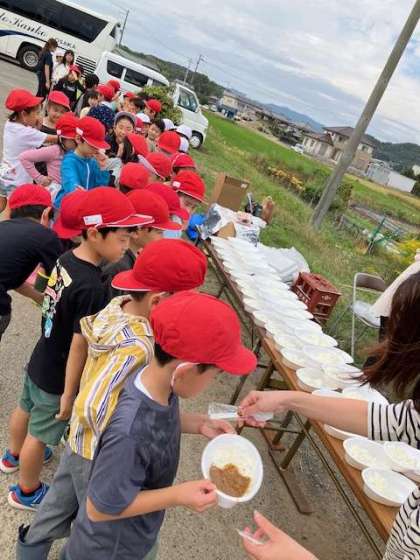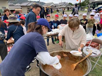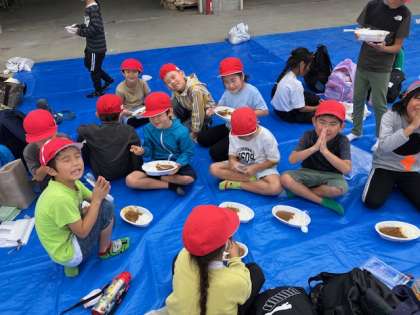 お昼ご飯は、手作りカレーです。学年順に1年生から。
