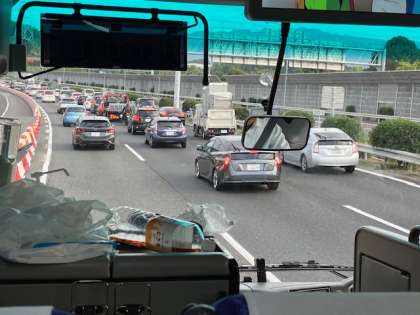 現在、西宮北あたりですが、渋滞が数キロあるので、学校到着予定は、午後5時頃です。
