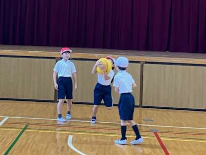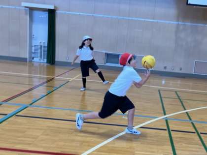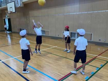 2年生の体育の時間。今日は、ボールの投げる・受けるをしています。上に投げて名前を呼ばれた子がキャッチしたり、地面にバウンドさせたボールを取ったり、ボール種目の基本練習です。