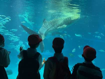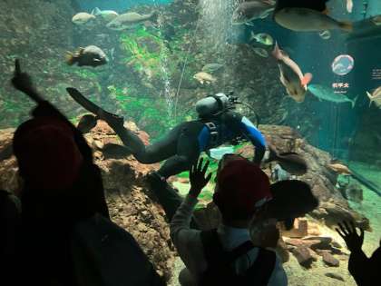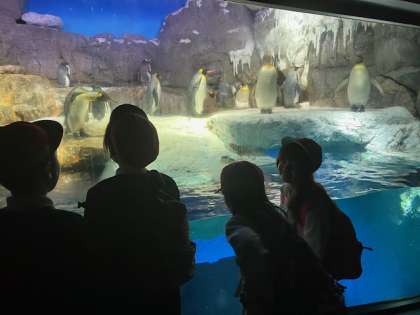 ペンギン、ダイバー、ジンベイザメ。興奮の嵐!豊仁小学校の子どもたちの甲高〜い大声が響き渡ってます。耳がキーン。