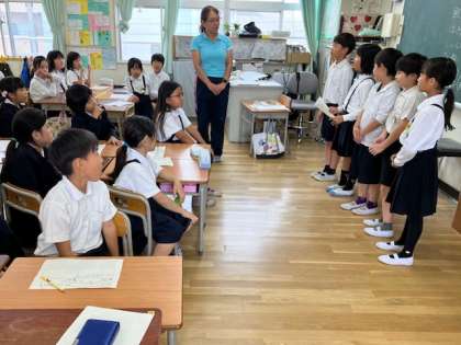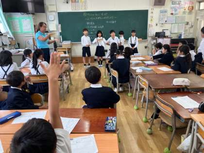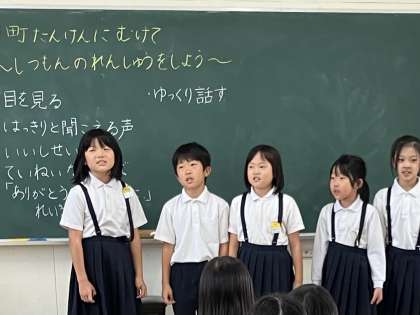 2年生は、明日、町たんけんに出かけます。2年生が班ごとで10か所のお店に行って、お話を聞いてきます。今日は、その最後の練習をしました。