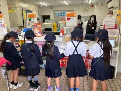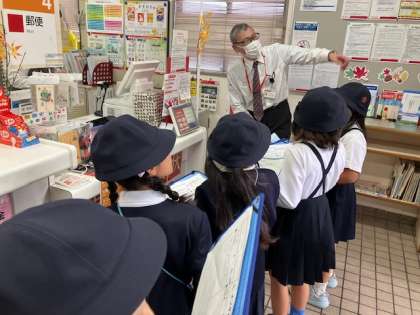 郵便局に出かけた班。まずみんなで最初のあいさつから。その後、いつできましたか?、郵便局は全国にどのくらいありますか?、どんな仕事をしてますか?、お仕事は難しいですか?などなど、練習してきた質問をして、答えていただいたことを書きとめました。急ぐので全部ひらがなです。