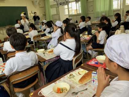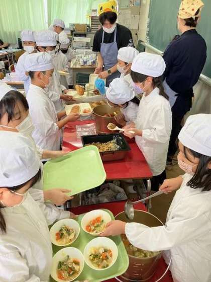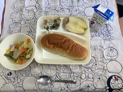 今日の給食献立は、黒糖パン・ほうれん草のグラタン・スープ煮・りんご・牛乳です。